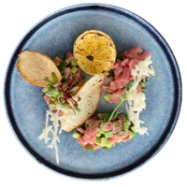 Телятина, сыр пармезан, салат: листовой, айсберг, руккола; огурец, шампиньоны, чеснок, сметана, майонез, соус сладкий бальзамик